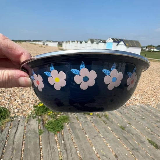 Beautiful Enamel Bowls in Midnight Navy Blue Retro Daisy Floral Print - Enamelhappy
