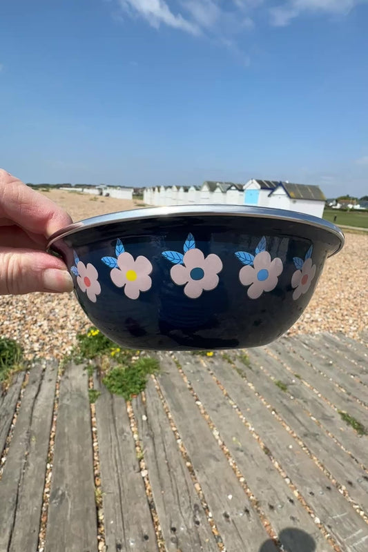 Midnight Navy Blue Retro Daisy Enamel Bowls - Enamelhappy